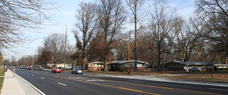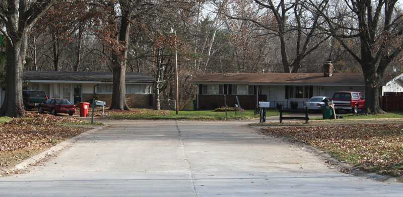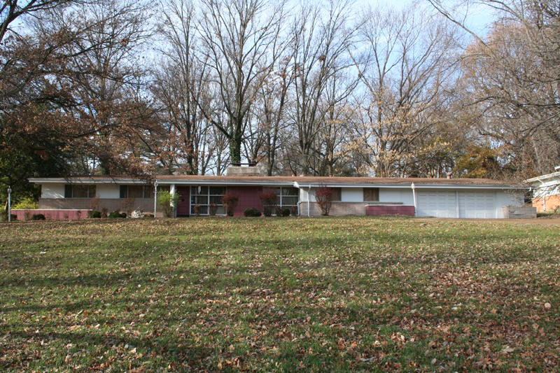 North of where it passes River Roads Mall, Halls Ferry Road and it surrounding streets are lined by a remarkable collection of 1950s ranch houses -- archetypal one-story buildings with low-pitched roofs, carports, large picture windows and inclined columns. The entire neighborhood appears to have sprung up almost overnight, so unified are its buildings.