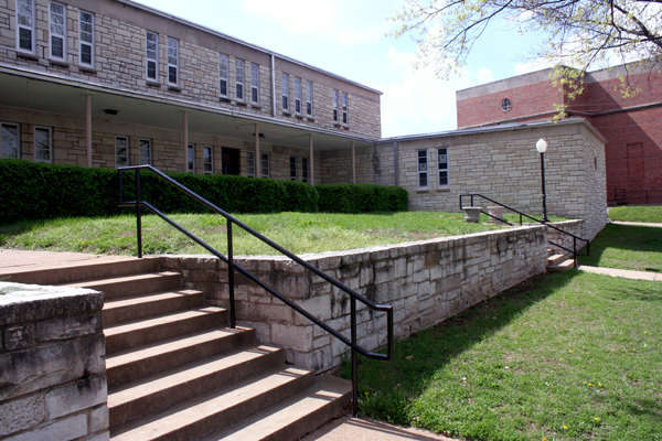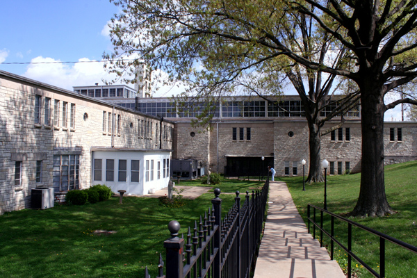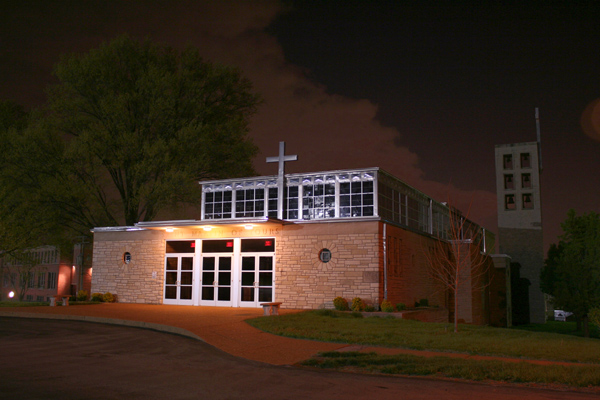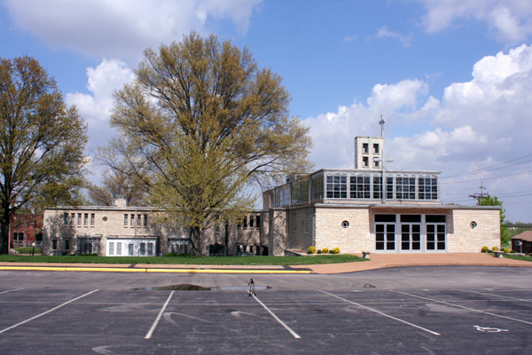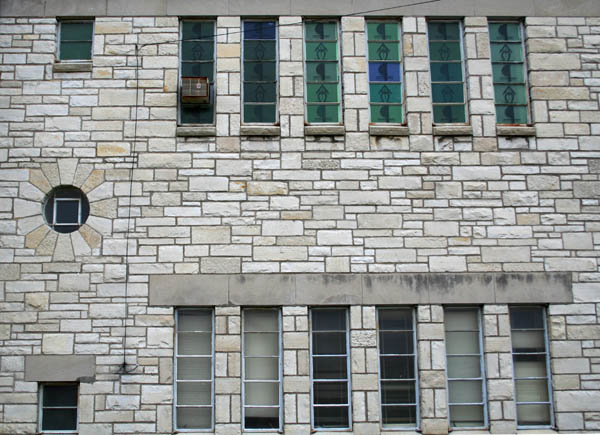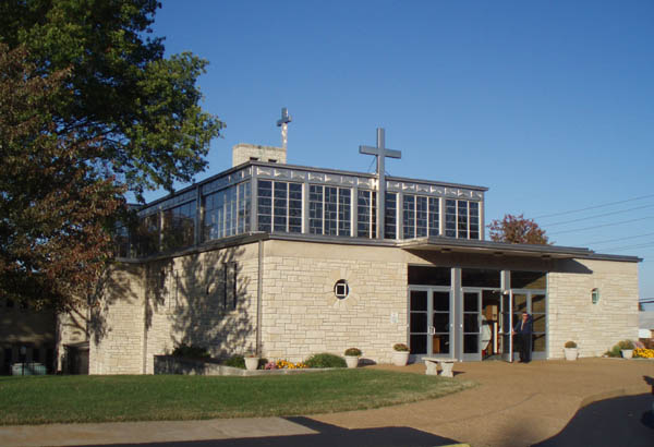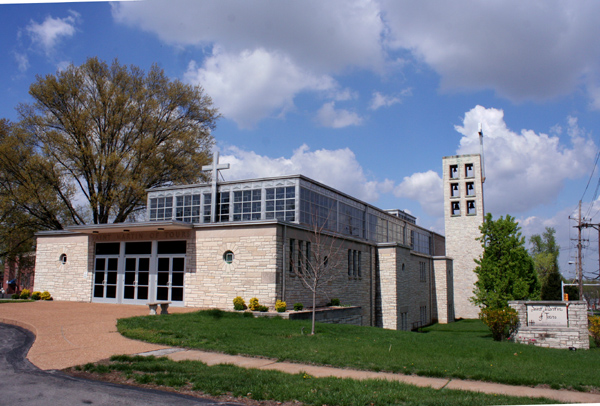 An almost primitivist building - a stone box with a stainless steel clerestory that brings in filtered light through Emil Frei stained glass. The limestone construction, and its transformation from one story to two as the hill drops out beneath it, make the building reminicent of the limestone bluffs that crop out here and there in the city and county.