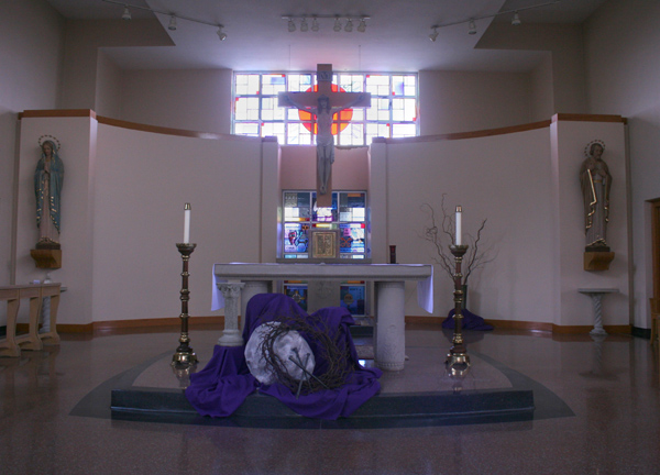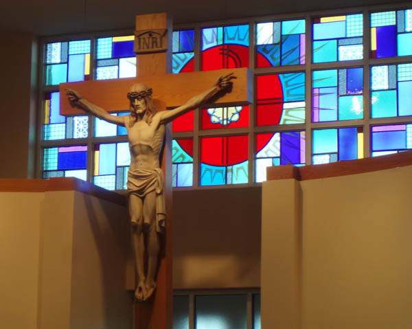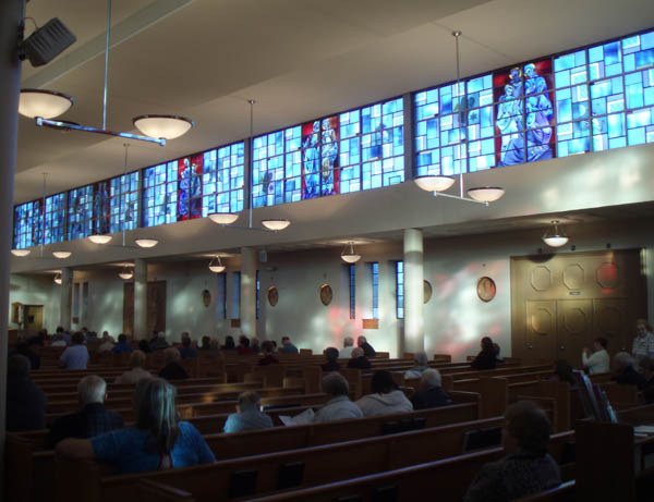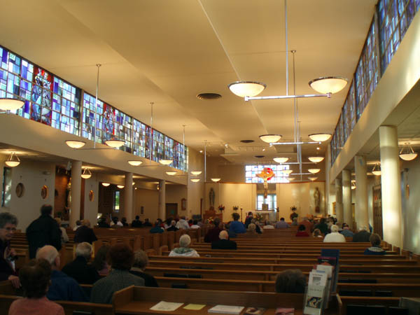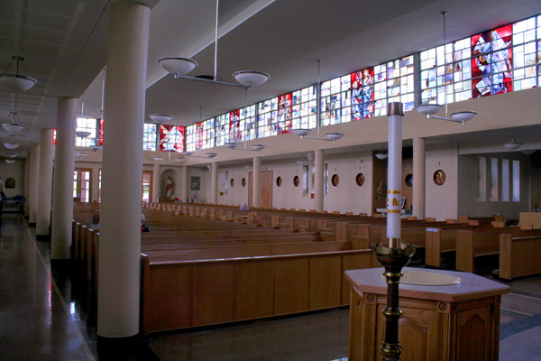 The building includes not only the sanctuary but a basement parish hall as well, and an attached rectory built at the same time. The complex was so completely designed that the bus stop on the corner is built of the same limestone, with the same stainless steel trim.