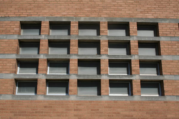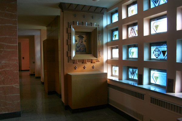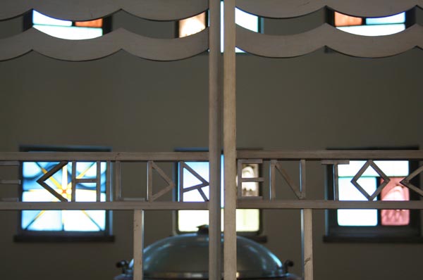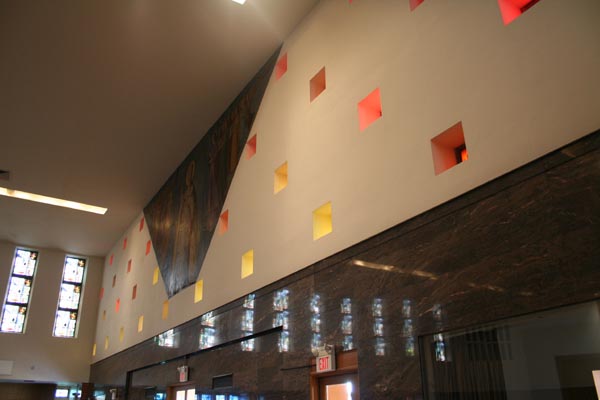 Within, the building is marked by stained glass broken into small panels that work together to achieve varied and delightful effects, disolving entire side walls and pocking the rear wall with flecks of colored light.