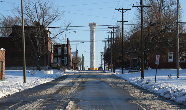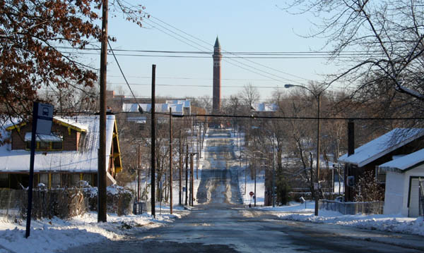 The hills in this area provide a dramatic viewpoint for the two standpipe towers at Grand Avenue.