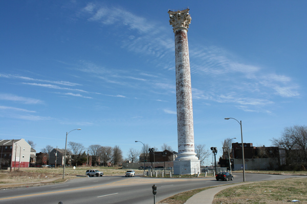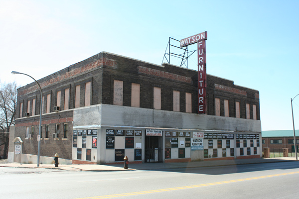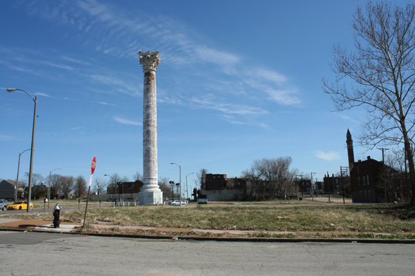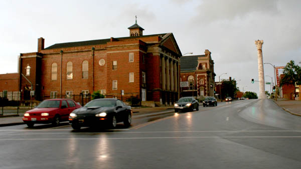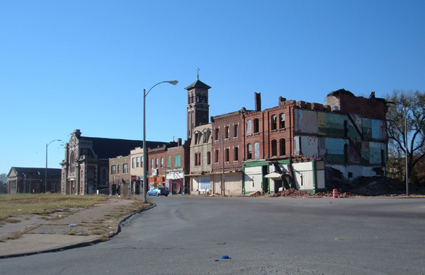 The traffic circle surrounding the white watertower once was lined with commercial buildings; most of them are gone now, and the survivors continue to diminish.