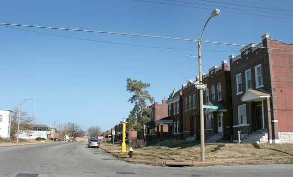 Warne Avenue is a broad street with some spillover commercial buildings from W. Florissant Avenue.