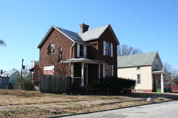 More houses from the blocks west of Fairgrounds Park. One-time mixed-use buildings remain, with storefronts often empty or converted to ramshackle apartments.