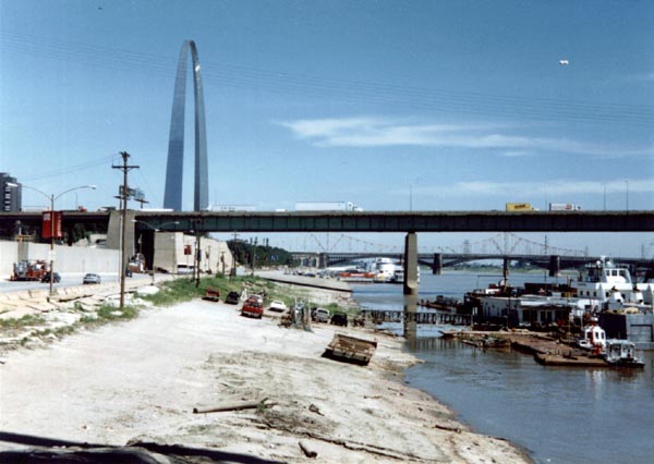 When the Mississippi does reveal itself, as it does for a brief stretch in the shadow of the Gateway Arch, it's not a picturesque place. The wild, tractless river that Mark Twain knew in his steamboat days are long gone, and in its place is a working river, a vast industrial highway crammed with barge tows, loading points, and industry. At the Arch, where the river is most visible to the public, commercial development has been haphazard and low budget, with no guiding plan and aethetics at the bottom of the list of concerns.