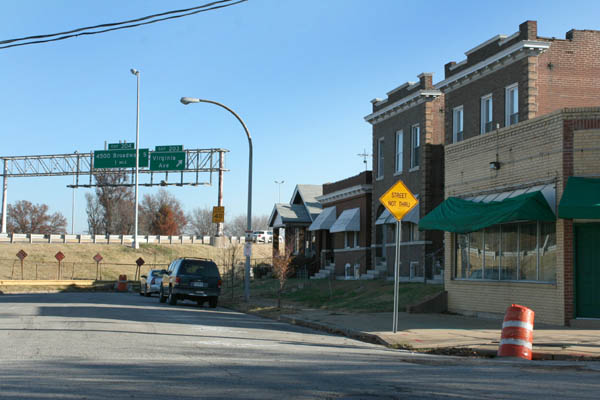 Like many St. Louis neighborhoods, Carondelet was sundered by the arrival of the Interstate highways in the 1960s. Many streets simply dead end at the I-55, which rides through the area on berms and overpass bridges.