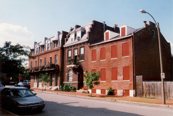 Allen Street steadily climbs to the west, and is lined with typical Soulard houses -- sturdy red brick stock, full-faced at the street with gallery wings behind, often backed by lovely and intimate gardens.