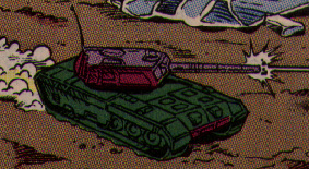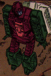 Abilities: Bludgeon's prowess at close-in fighting is legendary. He has one of the best rapports with his outer shell of all the Pretenders, and its organic musculature gives him lightening-fast reflexes and unparralled agility. He has no ranged weapons while within the shell, relying instead on a diamond-hard micro-serrated katana. While this might put a lesser Transformer at a disadvantage, Bludgeon's incredible agility and skill more than make up for it. The sword is not enhanced in any way; Bludgeon relies on his skill to give it its deadly effectiveness. Outside the shell, he transforms to a tank armed with an electropulse cannon. Though smaller and weaker in this form, he retains his martial art skills.