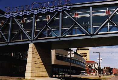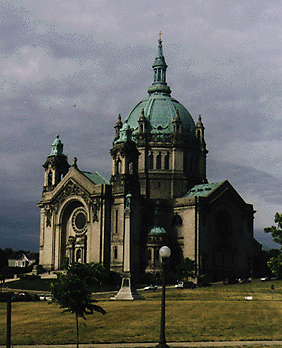 The flight to St. Louis was mercifullyshort. I was disappointed with the landing in St. Louis; I loveflying over my old home town, but between the haze and our flightpath I didn't get to see much of anything recognizable on theground below. The connecting flight was even shorter, and by 11:00am Central time I was threading my way through the Minneapolisairport. A cab ride delivered me to the Best Western (Beast Warsian?)Kelly hotel, situated on the edge of downtown St. Paul, just acrossthe highway from the tall buildings (well, I mean "tall"in a very relative way. :] As we pulled up, my attention was rivetedby a magnificent domed church building, situated on a hill topnearby. "So THAT is the Cathedral everyone's always talkingabout," I thought, since both my friend from Minneapolisand the cabby had mentioned it as worth seeing. First thing Idid was grab my camera and walk over for a tour of the insideand outside... absolutely magnificent. After that I wandered intodowntown, intending to get some pictures of whatever architecturallyinteresting buildings there were. Completely by accident, I sawsigns for the RiverCenter, and figured I might as well see wherethe 'con was taking place. Wise choice, but as it happened, itmeant the end for my touring.