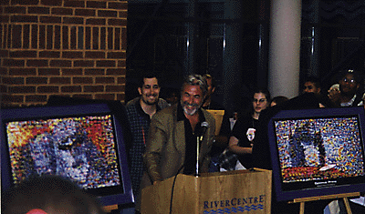 The two voice actor guests were introduced; the photomosaic postersof Optimus Prime and Megatron were unveiled, to much applause;the toy exclusives were displayed and walked around the room foreveryone to get a distant gander at; and the prize posters forthe trivia contest winners were shown. I meant to get a good lookat the trivia posters, but never did -- from afar, they lookedgorgeous, full renderings of the Season 3 Beast Wars cast. Thehighlight of the announcements, of course, was the news that thefirst episode of Beast Machines would be shown Saturday; likejust about everything, this news was met with much applause. OverallI'd describe the vibe in the room as very positive, though theHartmans were obviously frazzled. No wonder! These guys work damnhard to pull the whole thing together (as we learned Sunday),and this year's 'con was the biggest yet attendance-wise.