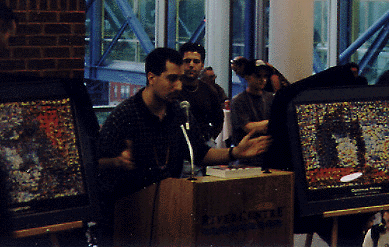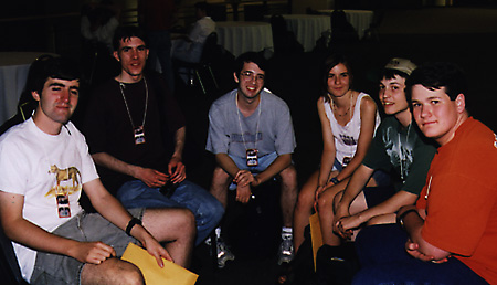 Back to the RiverCenter after that; after much waiting in lineand standing around (during which time I met EmarZero; not tillSunday did I finally learn that he and Hooper_X are one and thesame!), I acquired a couple of slices of pizza for dinner at thepre-party. Crowd control was definitely lacking this year; theevent suffered from taking place in a large hall rather than aconventional room like last year. Finally we gathered in a bigsemi-circle around Jon, Glenn and Karl for the welcome announcements.