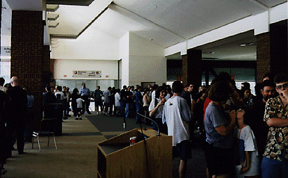 Around 5:30 pre-reg closed, and we allgot booted out of the convention center since the pizza partydidn't start up for another hour or three. A contingent of ussettled for getting food at the Subway's down the street fromthe RiverCenter. Yeesh. Subway's. I lived on the stuff in highschool, but since then I've gained something of an aversion tofast food, even good fast food... nevertheless I got in the line.No sooner had I done so than a voice from behind me said somethingalong the lines of "You wanted to meet me, didn't you?"I turned around to shake the hand of Chris Meadows, a tall, thin,lanky, bespectacled fellow. I had the pleasure of chatting aboutshow reviews and the recently completed Beast Wars show for awhile.