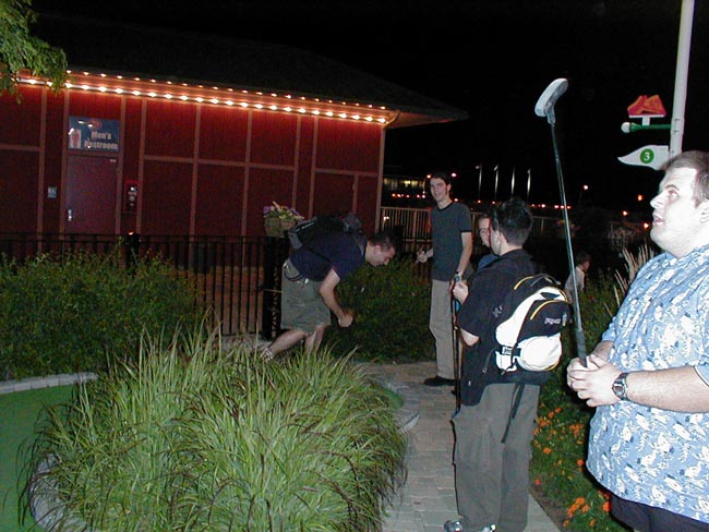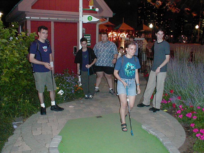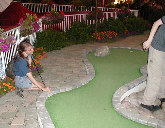 I forget what was so funny here, but it made Windy fall over laughing. Windy ended up kicking all our butts at mini-golf. I was putting in a nearly-consistent three shots per hole, but I had these three or four where I just suddenly lost all coordination or something and just kept hitting and hitting the damn ball all around the hole. Once the damn thing even went in the hole and leapt right back out. I was robbed, I tells ya! We were also unfortunately pursued by a band of obnoxious, impatient little kids who weren't really playing coherent golf but nevertheless couldn't think to just skip a hole or two ahead of us. Grr.