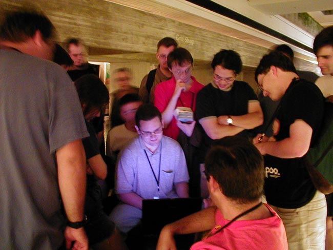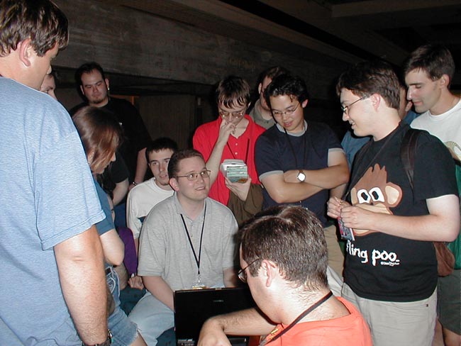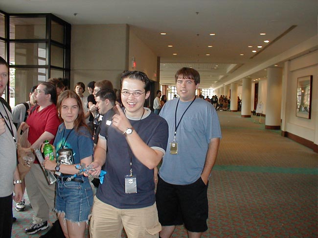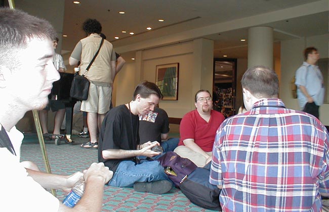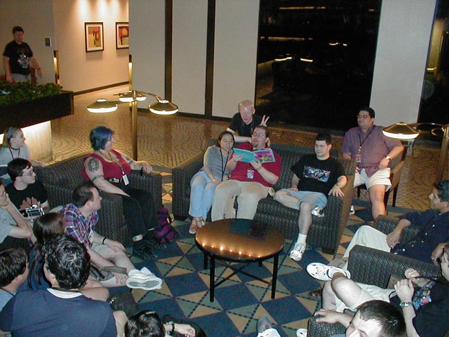 Mo' money, mo' spending, blah blah... I took another load of folks out for dinner at Subway that afternoon. Afterwards I sat down by myself to... what was I doing? I forget. Reading the comic? I honestly can't remember. At any rate, I sat down, and basically acted as a seed germ -- everyone just began accumulating around me, till we had this huge group gathered.