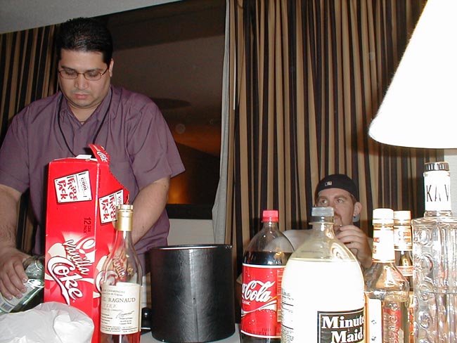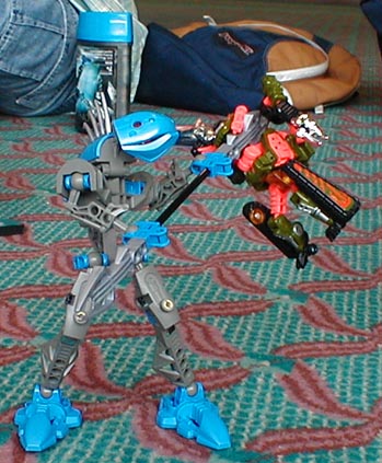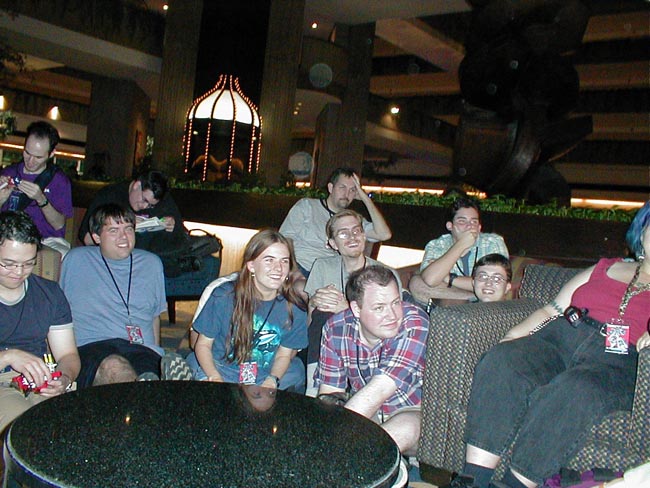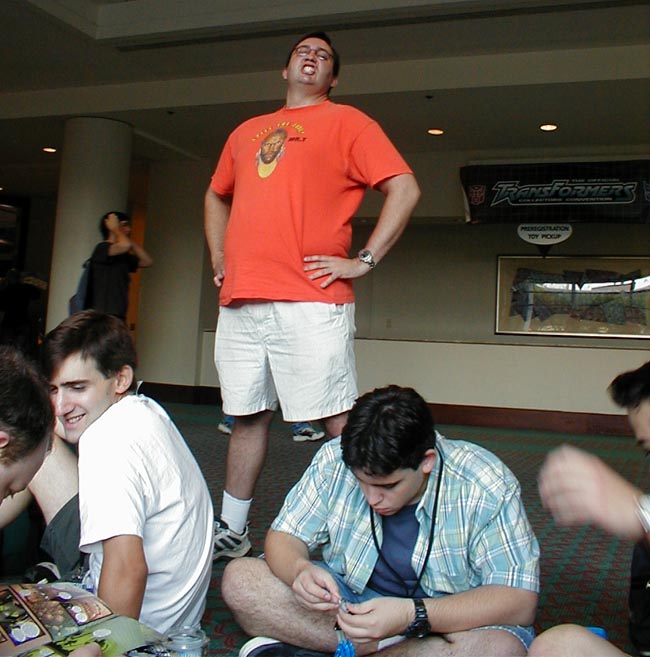 Still later I attached myself to a group including Swift, Quez and Phil. After wandering through the hotel bar (where I briefly met Dusty for the first and last time all weekend) we hijacked the video room long enough to watch the new Go-Go-Go-Bots cartoon, which is kind of bizarre and demented and seems to center soley on crazed psycho rebel bots who run around endangering everyone around them till they randomly come to their senses. Freaky. The evening ended back in the lobby where Phil showed us his wonderful samples from the MSTing: