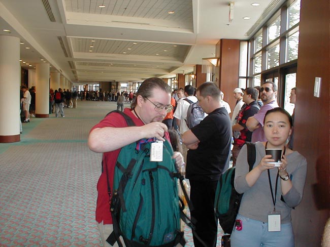 The dealer room was a good half hour late opening, which meant we waited there for about 90 minutes. But that's okay; it was a pleasant chance to talk to everyone, to goof off and relax, without everyone heading in a hundred directions at once.