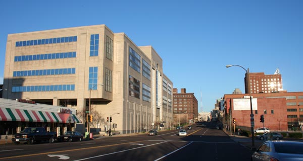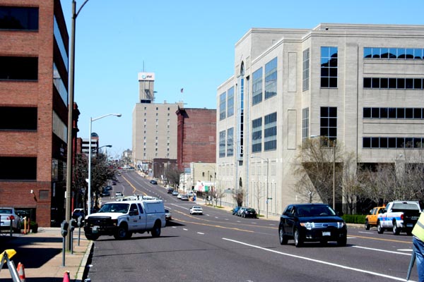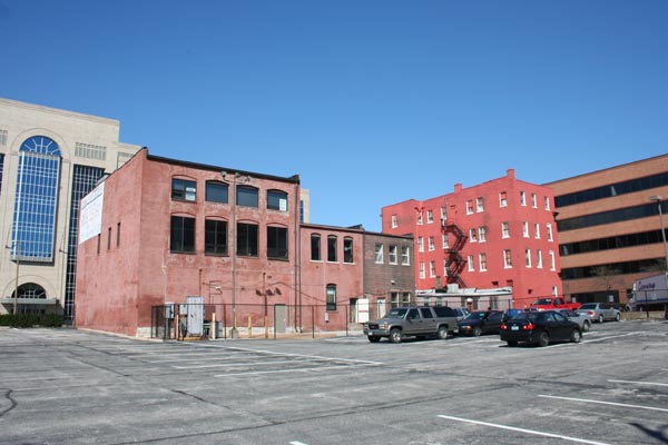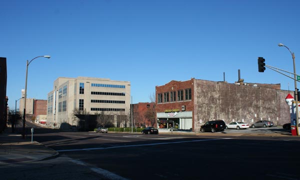 Olive Street lacks the more cohesive development that characterizes much of Locust Street. Parking lots abound, and the street itself is vast and overly wide.