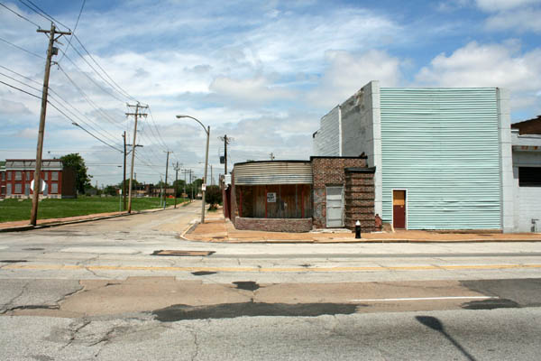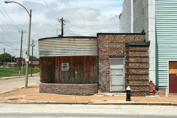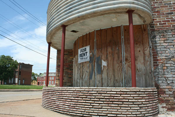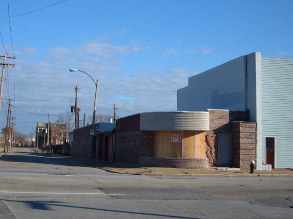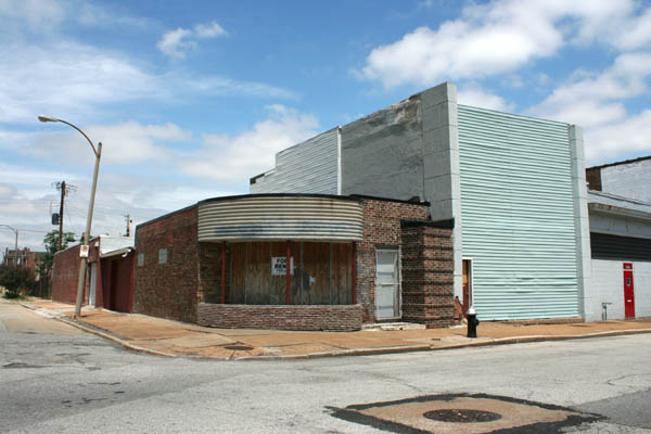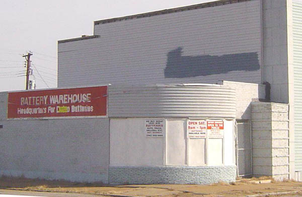 In the late 90s it was used as Battery Warehouse, a wholesale distributor. Once slathered under a heavy coat of white paint and bad window alterations, this Streamline Deco commercial building underwent a remarkable restoration between 2003 (when Kevin Keiffer photographed it in white) and 2005, when I shot the lower images. Delmar-Clark Realty seems to have dropped a fair bit of money on repairs in 2005 and, at the same time, stripped the facade of all that paint and restored the original recess of the curved windows, returning it to its original glory.