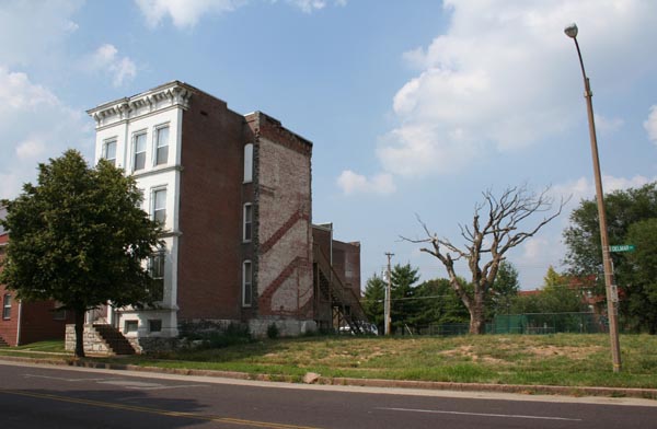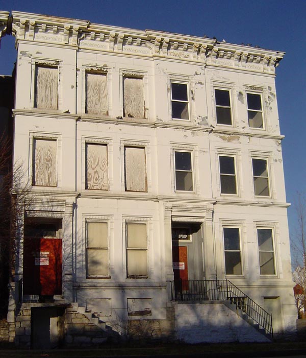 These lovely townhouses, part of a sequence known as Givens' Row, suffered a fire and were demolished under Paul McKee's ownership in November 2007. The fire damaged Blairmont's unit, as well as an LRA-owned unit adjacent. Only one separate unit, owned by another company, escaped the wrecking ball.