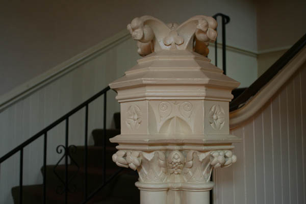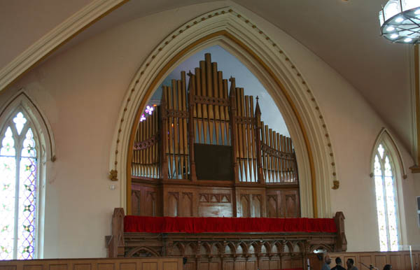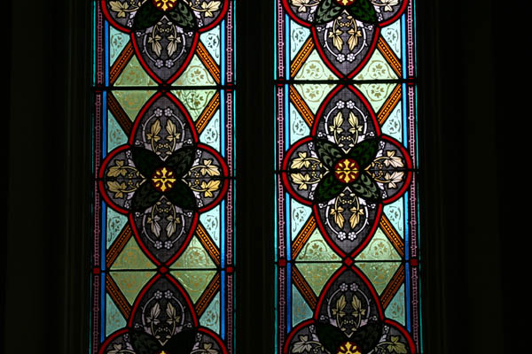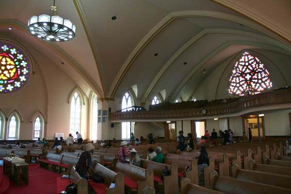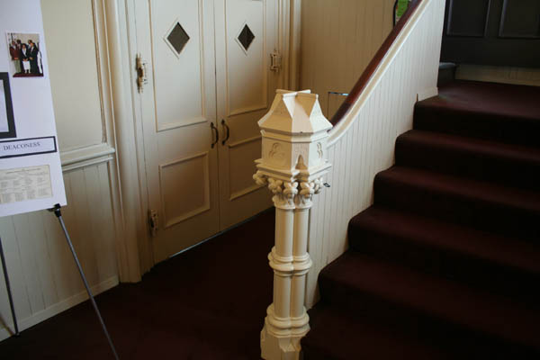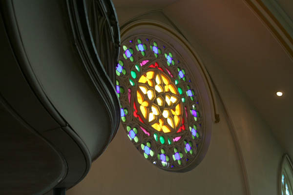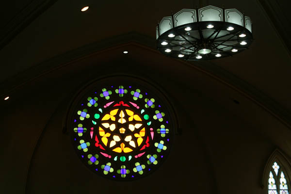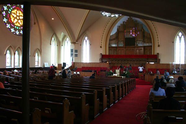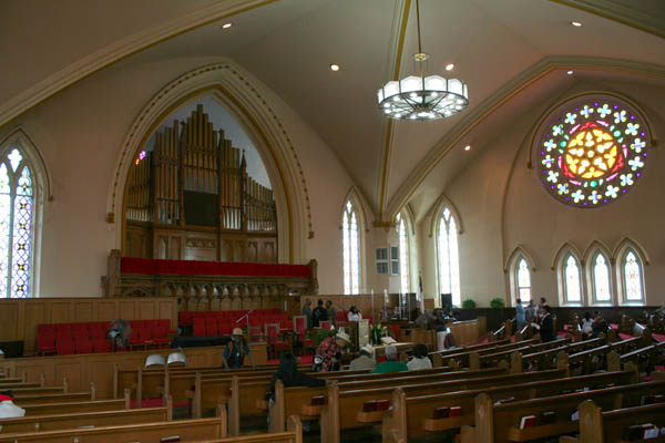Inside, the church's mixed heritage is obvious: elaborately detailed 19th Century doors, newel posts and stained glass designs survive in the lobby, while the rebuilt sanctuary contains broader, simpler designs that would have been more practical for the 1940s reconstruction. The grand space is outlined with relatively simple moldings and contains little in the way of extraneous decoration.