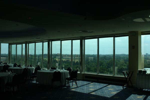 In 2009 I stopped by for a visit to the upper floor lounge and banquet spaces. The interior fittings on these spaces are fairly mundane, but the curving drywall ceilings are elegant. And the views are terrific, taking in the commercial and residential structures of the Central West End, the greenery of Forest Park, the distant hills of the south side, and the skyscrapers of Midtown and downtown to the east.