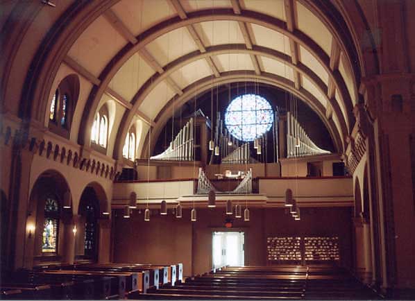 in both plan and styling. The interior has been remodeled several times and today is a fairly simple, unadorned space. Stained glass