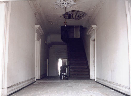 The image at left is the second story hallway of the original house. The large hole in the ceiling plaster