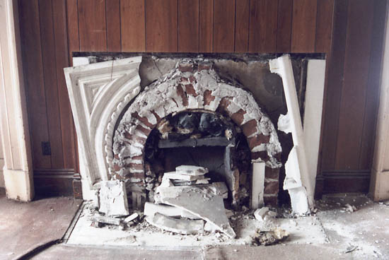 original lighting fixtures are missing, and the fireplace mantles have been smashed and destroyed as