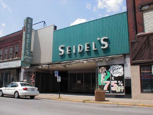 An empty clothing store, with a beautiful Mid-Century Modern facade in aqua, complete with a battered neon sign -- a close cousin of River Roads Mall in north St. Louis County. The signage was removed in 2005 and the vintage colors covered with black paint.