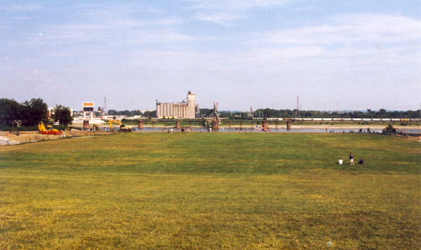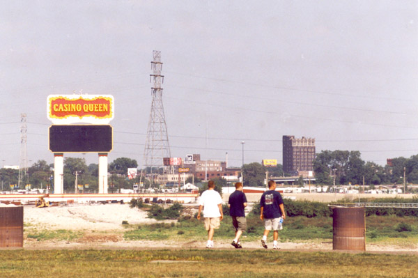 Don't be surprised if you can't. The city's downtown is a long way from the St. Louis riverfront... physically and metaphorically. Only the 13 story Spivey Building is clearly visible from the Missouri side (look just to the right of the Casino Queen's white, yellow and red sign.) Most St. Louis residents and visitors see it either from here, or zipping past it at 70 miles per hour on the way to the Illinois suburbs -- in other words, not at all. It's not just a literal statement.