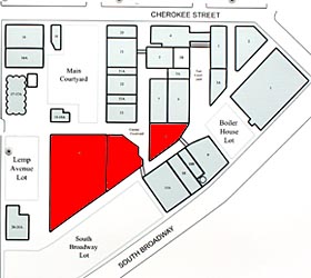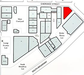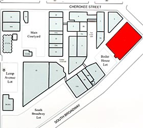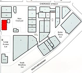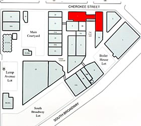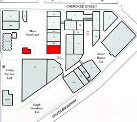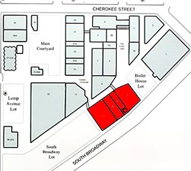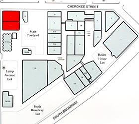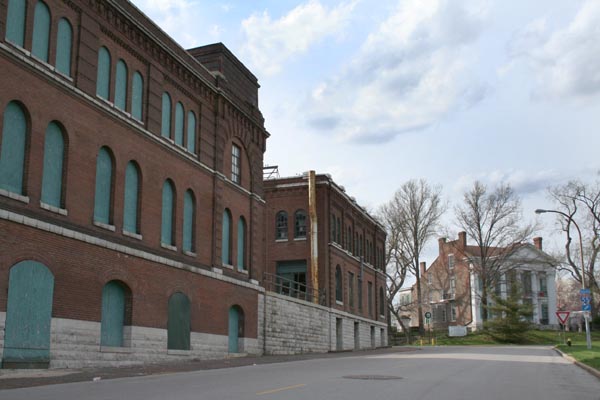 This chain of stacked up buildings originally held functions such as the carpenter's shop, machine shop, and ice house. Railroad tracks, bound for the river front, once entered the brewery grounds through the titanic archway. The tracks once criss-crossed the entire complex.