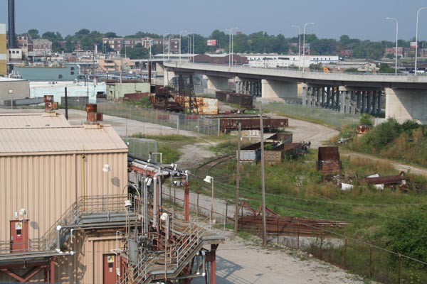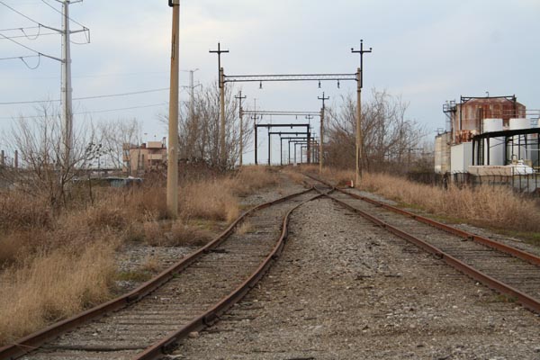 The decent of the elevated trestle that carried the rails across the industrial area. After touching down, the rails almost immediately began rising again to approach the bridge.