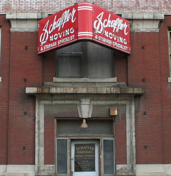 Schaffer Moving and Storage Specialist, with a handsome neon sign in front.