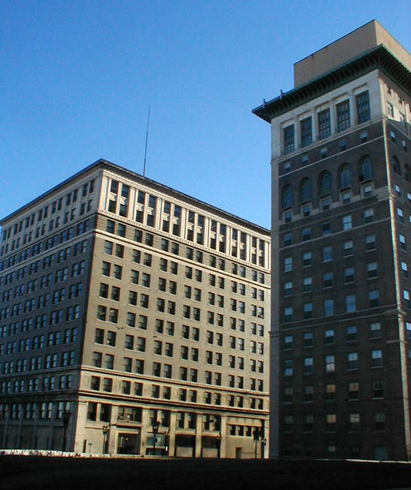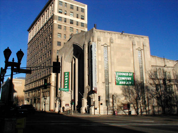 Beyond 3rd Baptist is a 1921 tower, the Missouri Theater building. The theater for which it is named no longer exists - it was located behind the tower, and was demolished in 1959.