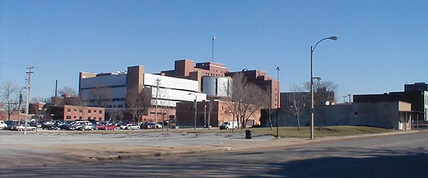 Looking across disused parking lots and vacant sites, the Veterans' Administration hospital complex looms