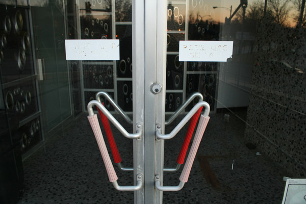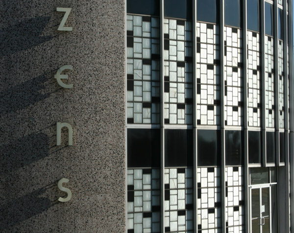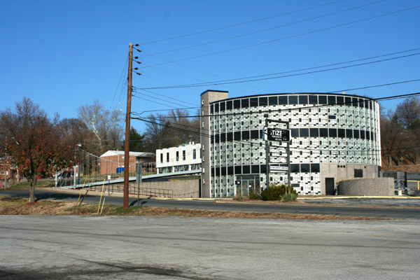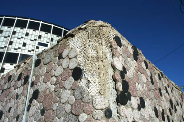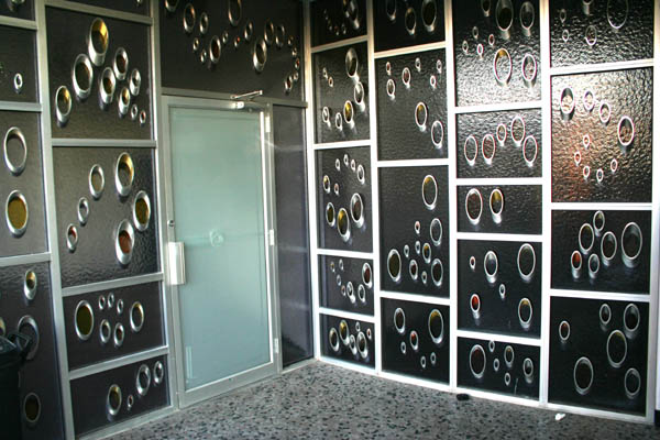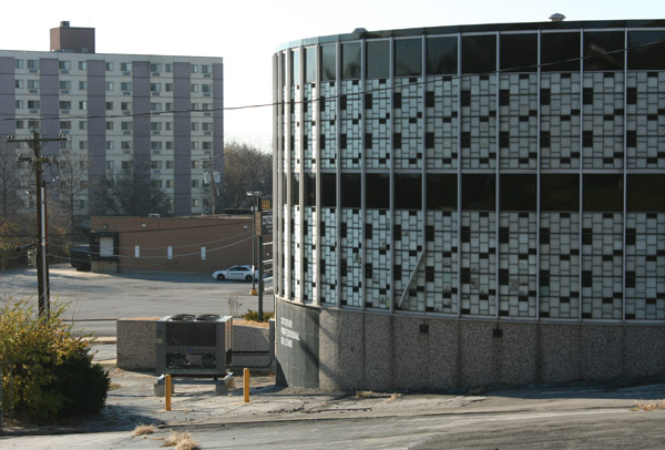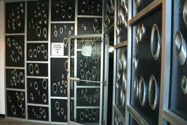 The facade is divided into vertical segments. Most are infilled with glass block, mostly colorless translucent, flecked with red and yellow colored blocks (unfortunately painted black some time after 20002.)