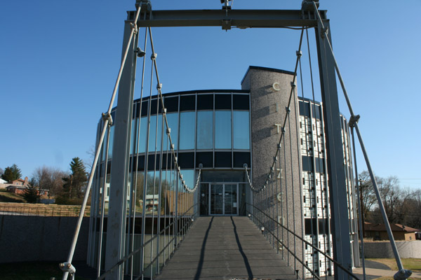 If you had the good fortune to be arriving from the corner of Berkshire and Wood River during the bank's heyday, you would cross the suspension bridge, passing over (according to the original plans) 6,000 square feet of reflecting pools with fountains.