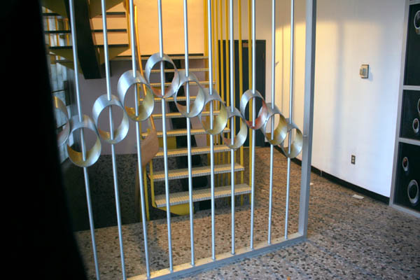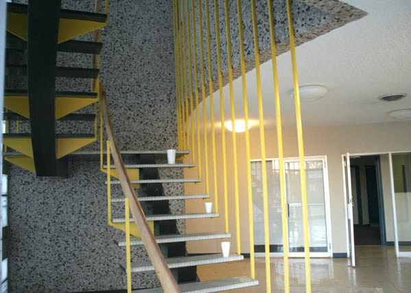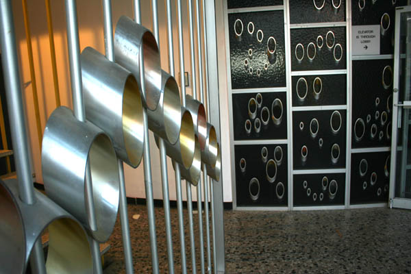 You might also have arrived from the rear parking lot, in which case your journey took you up this fantastic stairwell. Adjacent screen walls are tricked out with the same set of metal rings embedded in translucent plastic, a motif picked up by the vertical stainless steel rods that screen off the stairs - here, the rings are impaled on the rods. Notice that the inside of the rings are colored in red and yellow.