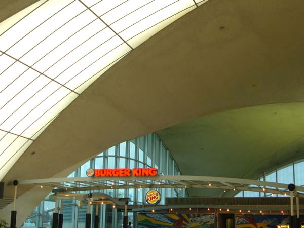 The interior space is cluttered with kiosks, fast food restaurants, ticketing booths, and queueing ropes -- unavoidable acoutrements of the present age, though perhaps the coming renovations will replace them with something more fitting to the building's futuristic vision.