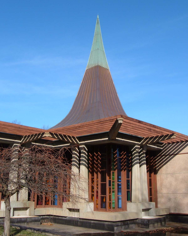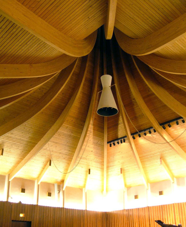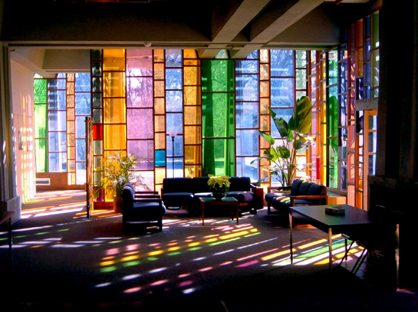 Sitting at the bottom of a steeply sloped site, the Meeting House is a complex grid of overlapping wood and concrete structural elements. Colored glass walls create a raucous symphony of light inside the entry foyer. Numerous elements, including the massive peaked roof and the grid of screening wood roof elements, speak to the influence of Frank Lloyd Wright. The pinacle contains a skylight to illuminate the elegantly spare meeting room below.