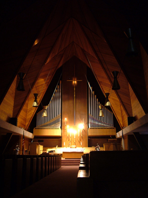 Independent Congregational Church's unmistakable roofline, dubbed the "folded fingers", is made of folded plywood plates, rising 44 feet and acting in compression to create a roof system with no columns, beams or arches.