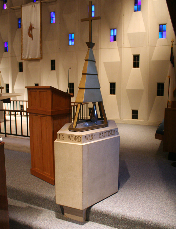 When I visited in 2009, the original pulpit and baptismal font - clearly designed specifically for the building - remained in place, but were slated for almost immediate removal as part of a renovation. It was the second such story I'd heard that day, and a familiar one with aging Mid-Century churches - struck with a hunger for "flexibility", congregations remove original fixtures and furnishings, degrading the artistic and architectural integrity of their sanctuary.