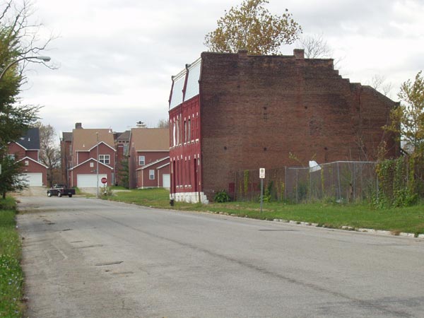 It's a hard building to figure out: 4 housing units, 2 houses, 1 structure. Elaborate stairs provide independent access to the upper story units, a common arrangement in St. Louis -- though these are clearly a recent addition; the originals were probably much more simple. The house sports a mandard attic front, a very common gesture on 19th century St. Louis housing; it's possible that this was not original -- Compton & Dry show it with a sloped roof.