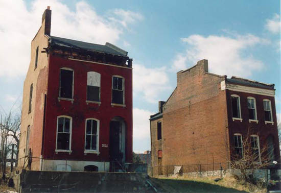 Top: Two abandoned houses on the 2900 block of Cass, March 2001. They have since been demolished. The massive new Vashon High School has since risen across the street.