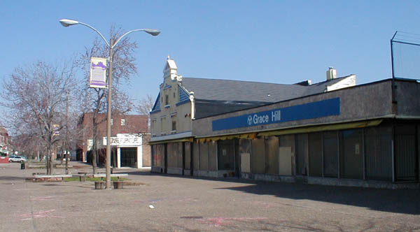 March 2003: This is the largely-abandoned 14th Street Mall, a two-block pedestrian shopping district set up in the 1970s that failed spectacularly. Such malls were a commonly attempted method of urban revival in that decade, based on the notion that removing cars from existing retail strips will attract pedestrians. In truth, unless a district is already thriving, an absence of automobile access simply pushes people further away. Automobile access is a vital component of most urban settings.