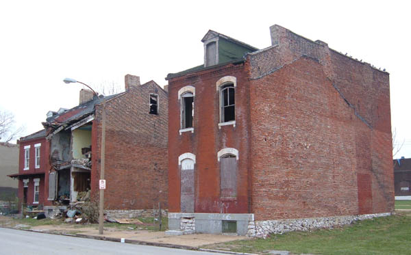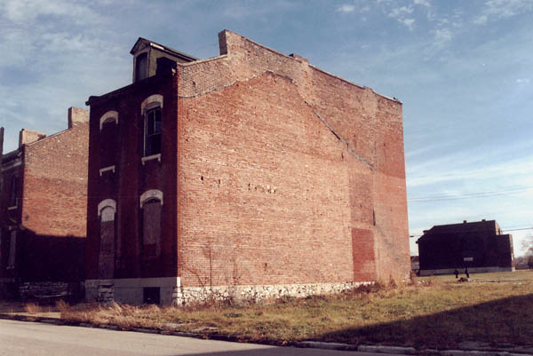 October 2002: The center house features well-proportioned windows, a modestly ornate cornice... and a front facade which is bulging out alarmingly.