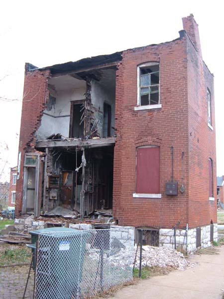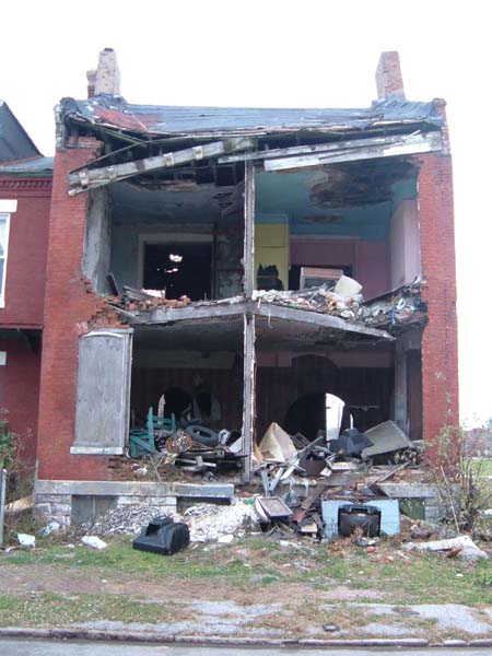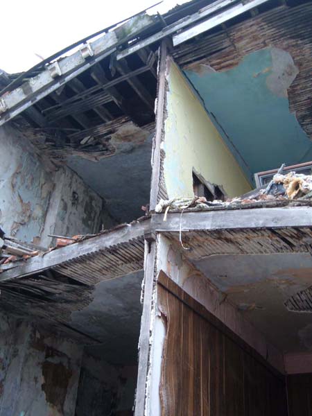 November 2005: Three years later, the unsurprising result of the facade bulge is calamitously visible: the entire front facade has collapsed.