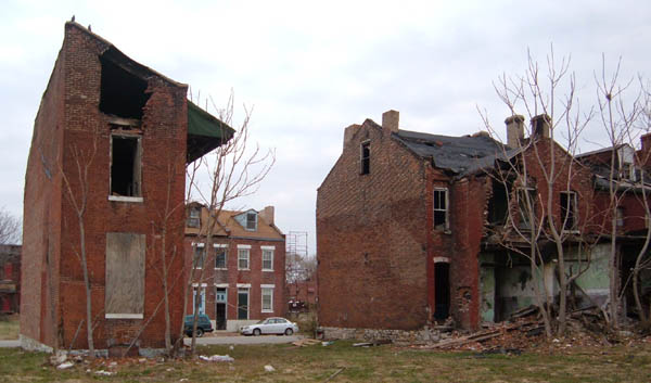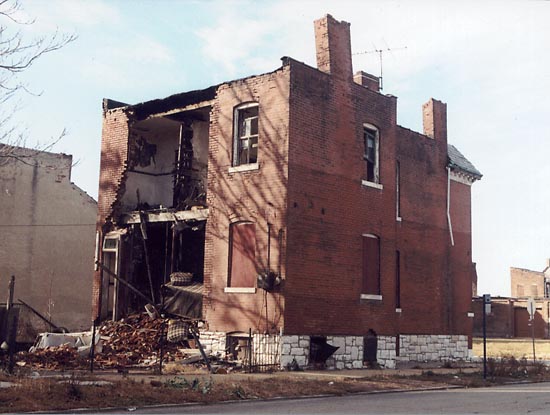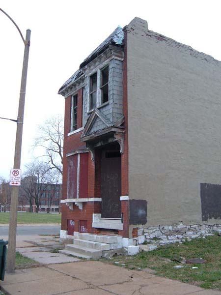 October 2002: At the end of the same block, the mandard-fronted house at 1300 Monroe has also suffered a disastrous collapse of its rear wall.