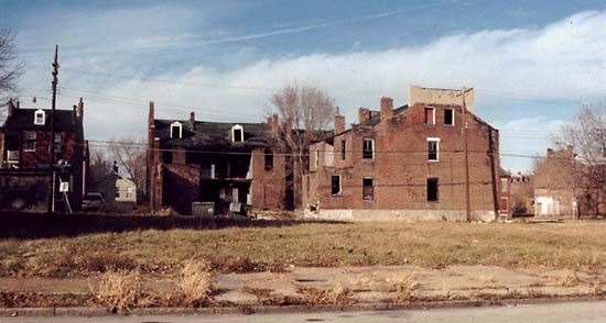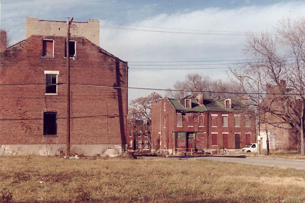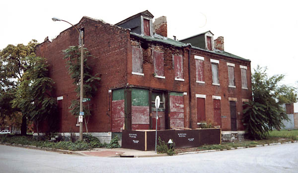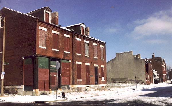 December 2002: The corner building has deteriorated badly. Unchecked, the loss of brick at the cornice would eventually cause the roof to collapse.