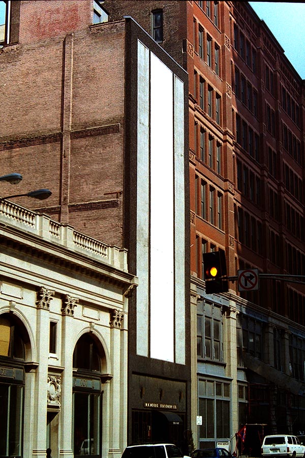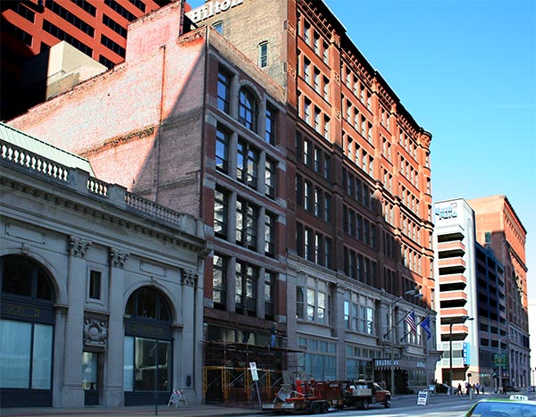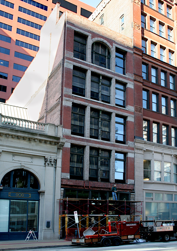 In 2004 the graceless panels were removed, revealing a modest but handsome Romanesque building of brick and stone, with large windows. The building's upper floors were converted to loft apartments, three per floor, with some borrowing light from windows opening up into the Merchants-Laclede Building's adjacent lightwell.